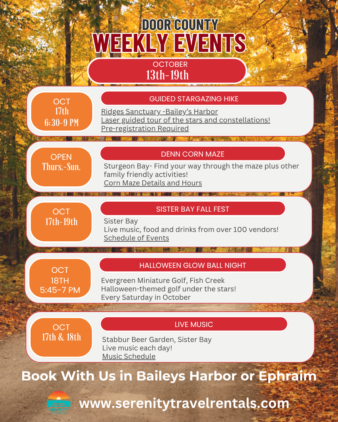 At Serenity Travel Rentals, we’re here to make your visit unforgettable. Fall in Door County is a season of color and charm — from scenic drives through golden forests and crisp hikes along the shoreline, to harvest festivals, pumpkin patches, and evenings by the firepit. Whether you’re here for a weekend escape or a longer stay, autumn brings endless ways to relax, explore, and enjoy.