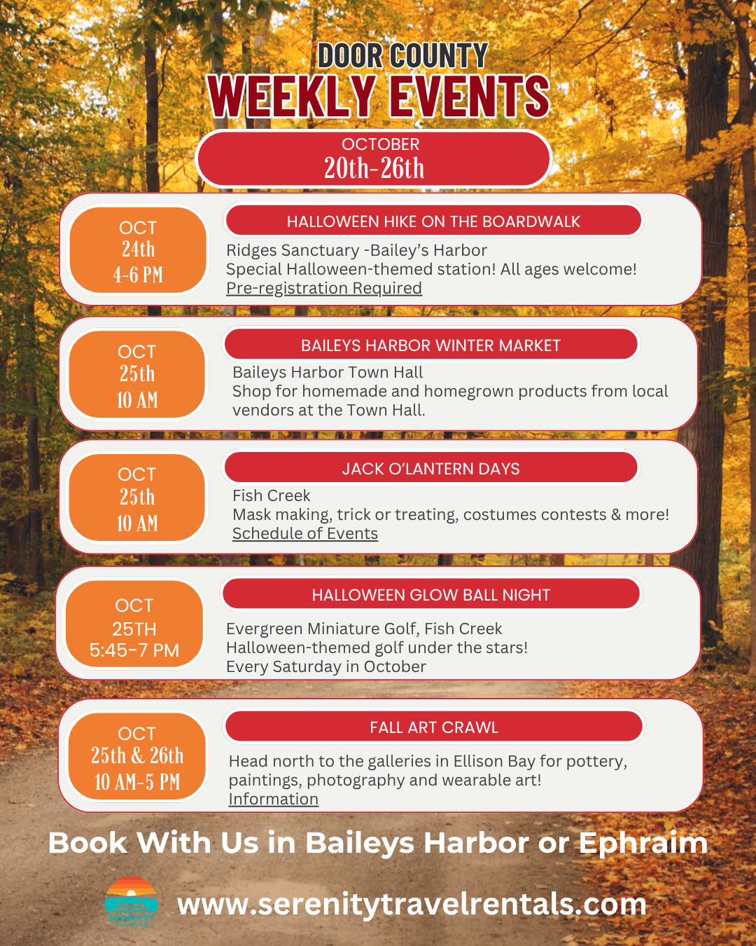 At Serenity Travel Rentals, we’re here to make your visit unforgettable. Fall in Door County is a season of color and charm — from scenic drives through golden forests and crisp hikes along the shoreline, to harvest festivals, pumpkin patches, and evenings by the firepit. Whether you’re here for a weekend escape or a longer stay, autumn brings endless ways to relax, explore, and enjoy.