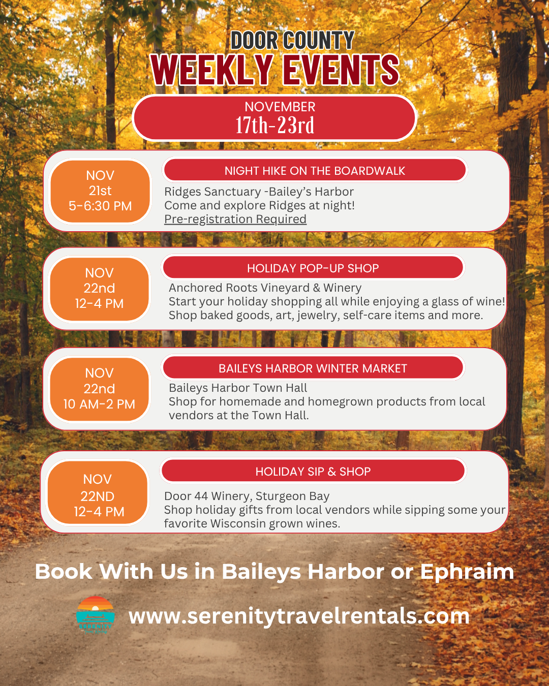Make sure to follow us on Instagram @serenitytravelrentals, Facebook at Serenity Travel Rentals and Instagram @serenitytravelrentals for the latest updates on all the happenings in Door County. Also, sign up for our newsletter on our website. We'll share details about upcoming events, special promotions, and insider tips to help you make the most of your stay.