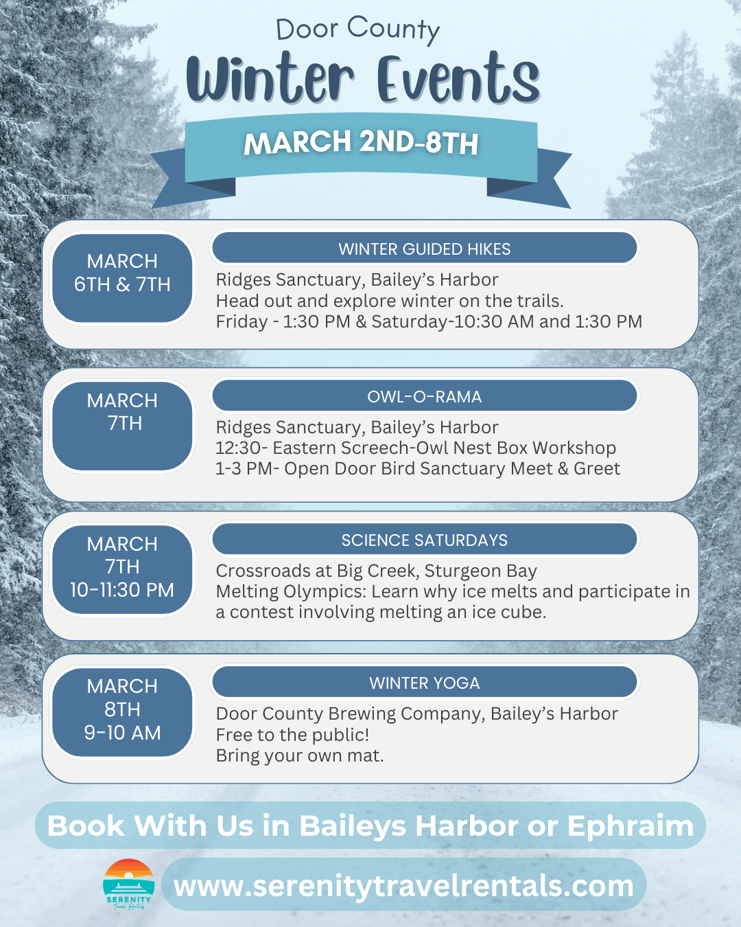 Make sure to follow us on Instagram @serenitytravelrentals, Facebook at Serenity Travel Rentals and Instagram @serenitytravelrentals for the latest updates on all the happenings in Door County. Also, sign up for our newsletter on our website. We'll share details about upcoming events, special promotions, and insider tips to help you make the most of your stay.
