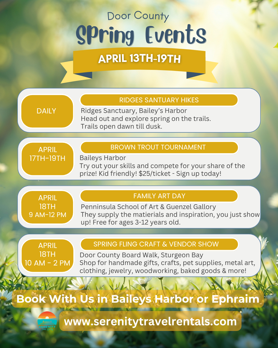 Make sure to follow us on Instagram @serenitytravelrentals, Facebook at Serenity Travel Rentals and Instagram @serenitytravelrentals for the latest updates on all the happenings in Door County. Also, sign up for our newsletter on our website. We'll share details about upcoming events, special promotions, and insider tips to help you make the most of your stay.